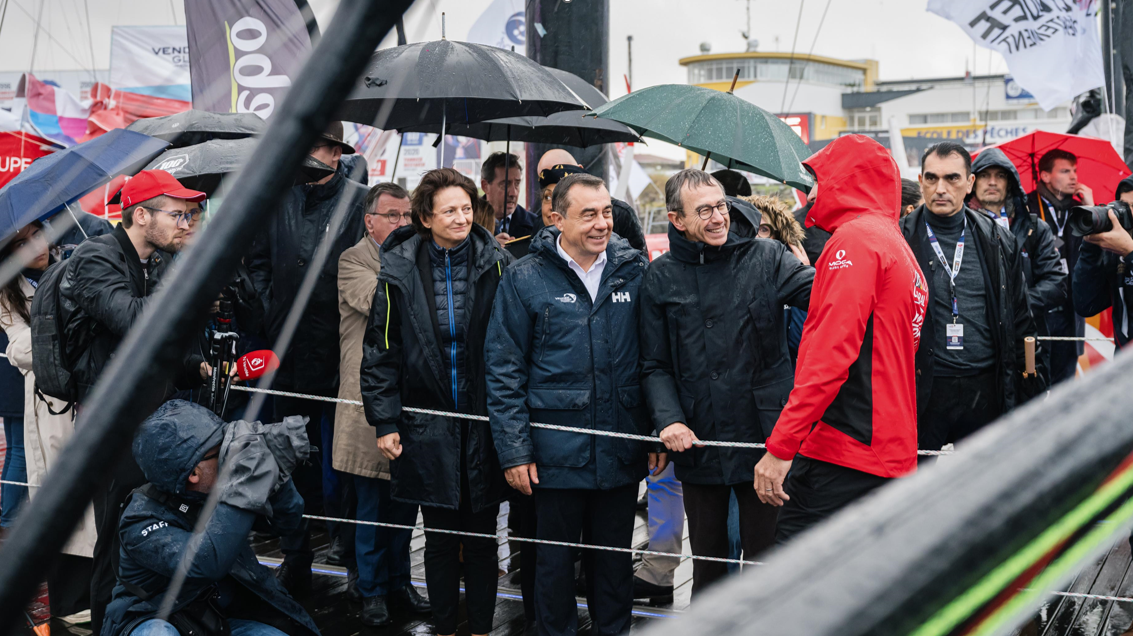 Malgré les averses qui ont redoublé d’intensité au fil de la matinée, le village du Vendée Globe a été inauguré ce samedi matin à 9h. Pour l’occasion, le Président du Vendée Globe et du Conseil départemental de la Vendée, Alain Leboeuf, a accueilli un de ses prédécesseurs et actuel ministre de l’Intérieur, Bruno Retailleau. Un moment solennel en présence de Patricia Brochard, co-présidente de Sodebo, Yannick Moreau, maire des Sables d’Olonne et président des Sables d’Olonne Agglomération, et d’Isabelle Leroy, vice-présidente de la Région Pays de La Loire et de l’ensemble des skippers. Désormais, place au grand public qui peut profiter du village jusqu’au départ, le 10 novembre prochain.