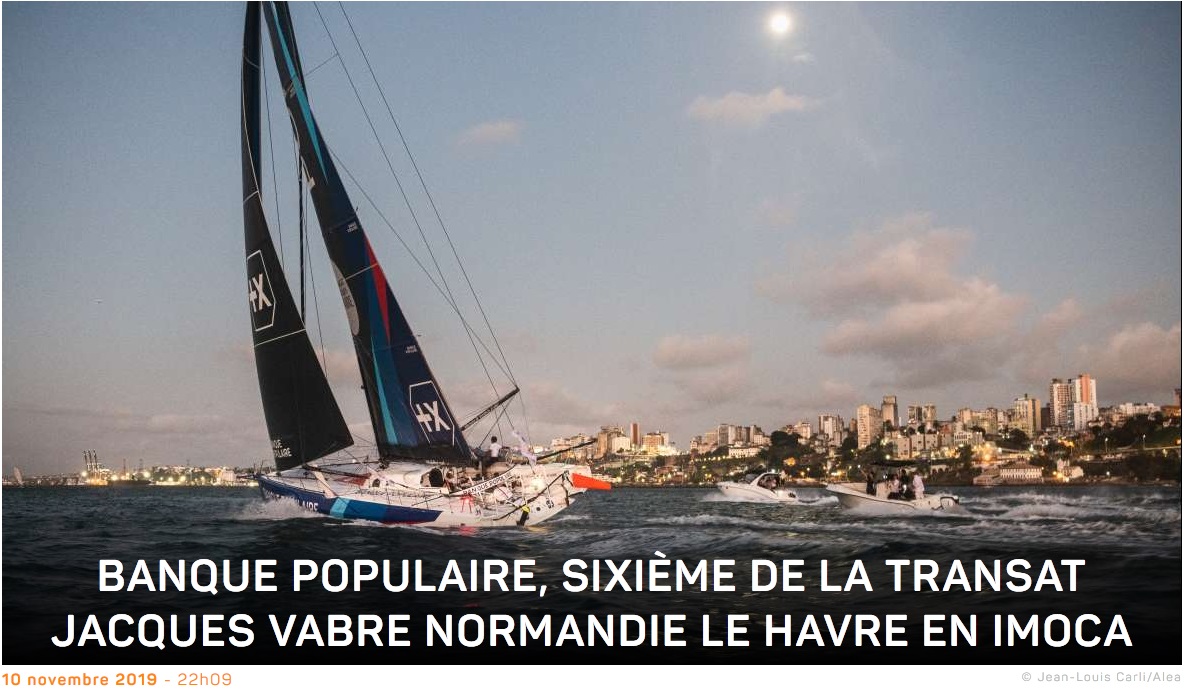 Ce dimanche 10 novembre, à 22h 01mn 24s (heure française), Clarisse Cremer et Armel Le Cléac’h ont franchi la ligne d’arrivée de la 14e édition de la Transat Jacques Vabre Normandie Le Havre en sixième position de la catégorie IMOCA. Le duo aura mis 14 jours 8h 38mn et 24s pour parcourir les 4 350 milles théoriques depuis Le Havre à la vitesse moyenne de 12,62 nœuds, mais il a réellement parcouru 4862 milles à 14,10 nœuds. Son écart au premier Apivia est de 20h 38mn 24s.