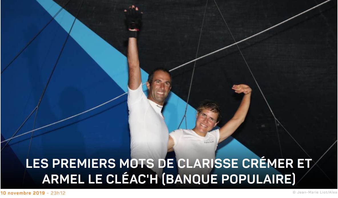 Armel : C’était bien, il y a eu du jeu en termes de stratégie, on est arrivé à tirer les bons bords, jusqu’à la sortie du Pot au noir. Notre route météo était pas mal, ce qui nous a permis de sortir en deuxième position du Pot-au-noir. Ensuite, c’était évidemment plus compliqué contre les foilers, il nous manquait un turbo ! Avec Banque Populaire, nous avions plusieurs objectifs au départ : d’abord, l’ambition que Clarisse apprenne sur le bateau et comme on a eu plein de conditions différentes, je crois que ça a été très profitable. Ensuite, on voulait terminer premier équipage à dérive. C’est fait. Premier équipage mixte, c’est fait. On aurait bien voulu le top five, mais c’était difficile de résister aux avions de chasse qui nous rattrapaient. Il faut rester philosophe. Notre bateau a presque 10 ans et il faut rester réaliste. C’est bien aussi pour Clarisse de se lancer sur le Vendée Globe sur un bateau comme celui-là qui est fiable et plus facile que les derniers foilers. Elle a vu comment on pouvait mener le bateau à 100% et elle sait jusqu’où on peut arriver. Après elle se gèrera et j’ai confiance en elle.