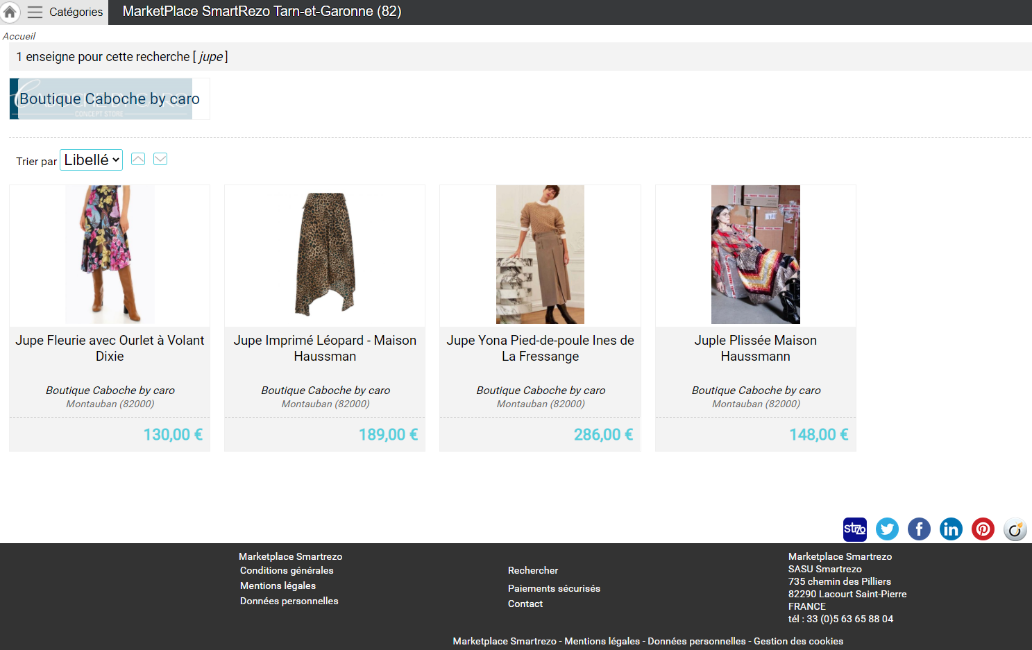 Mais ne restons pas dans le négatif, Smartrezo aimerait pouvoir aider les commerces et les producteurs et cela le plus rapidement possible. Nous sommes en capacité de mettre en ligne des boutiques e-commerce/drive en moins de 4h00 et si des commerçants veulent découvrir de quoi il s’agit, nous les invitons à suivre ce lien et de par exemple taper le produit « jupe » https://www.smartrezo.com/d22-tarn-et-garonne-82/annuaire.html