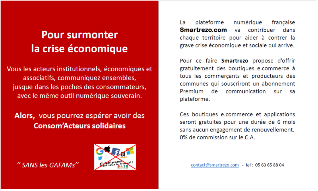 Puisque Madame Brigitte Barèges dit se battre pour ses commerces, nous la prenons aux mots, et lui proposons une fois encore d’accepter de rajouter Smartrezo dans ses outils de communication, en plus de ses pages chez les GAFAM, et comme nous le spécifions sur notre plateforme, nous offrirons gratuitement des boutiques e-commerce à l’ensemble des commerces et producteurs de Montauban ou du Grand-Montauban.