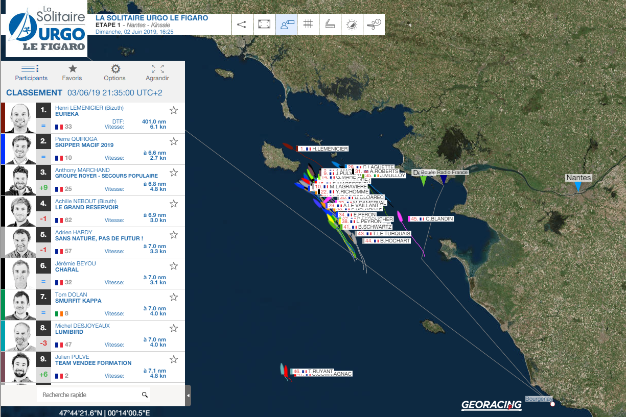 Mais au jeu du qui perd gagne, force est de constater que certains ont mieux tiré leur épingle du jeu que d?autres. A commencer par les deux leaders Adrien Hardy (Sans nature, pas de futur) et Michel Desjoyeaux (Lumibird) talonnés par Pierre Quiroga (Skipper Macif 2019) passés entre Yeu et la côte avant de se recentrer juste devant le gros du paquet resté à l?Ouest de l?île. Pendant ce temps-là, un groupe d?une dizaine de concurrents emmenés par le bizuth Achille Nebout (Le grand réservoir) suivi du triple vainqueur Jérémie Beyou insistaient à droite et trouvaient un peu plus de pression pour contester le leadership d?Hardy-Desjoyeaux cet après-midi .