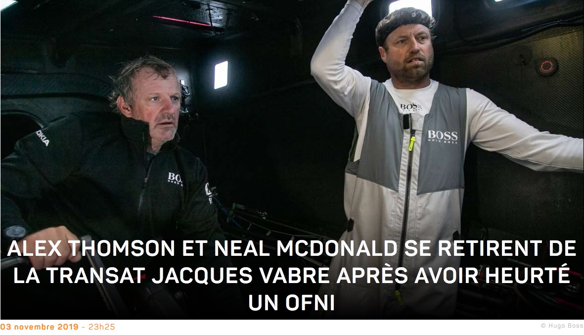 L'incident s'est produit au septième jour de la Transat Jacques Vabre Normandie Le Havre, la course transatlantique en double la plus longue et la plus difficile au monde qui emmène les skippers, en duo, sur un trajet de 4 350 milles entre Le Havre et Salvador, Brésil. Lorsque le bateau HUGO BOSS a heurté l’OFNI, Thomson et McDonald avaient parcouru plus d'un tiers du parcours, et étaient situés à environ 380 miles au nord-ouest des îles Canaries.