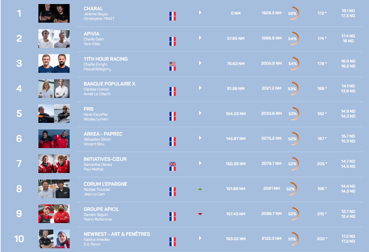 Maintenant qu’en tête de flotte tous les IMOCA naviguent bâbord amures, la lecture du classement est plus simple et les positions se clarifient. Charal est toujours le patron et grappille mètre par mètre sur ses poursuivants. Son matelas est de 53 milles sur Apivia, le plus important depuis le départ. Derrière, un petit paquet de trois bateaux joue collé serré. 11th Hour a soufflé la troisième place à Banque Populaire par son petit décalage ouest et PRB est juste derrière aux aguets. Cinquante milles en retrait, Initiatives-Coeur, Corum L’Epargne, Groupe Apicil et Arkéa Paprec sont alignés comme sur une ligne de départ à 2000 milles de l’arrivée. Sur ce long bord où il est armé de son foil, le plan Kouyoumdjian du tandem Simon-Riou a repris deux places hier et peut encore rêver de podium.