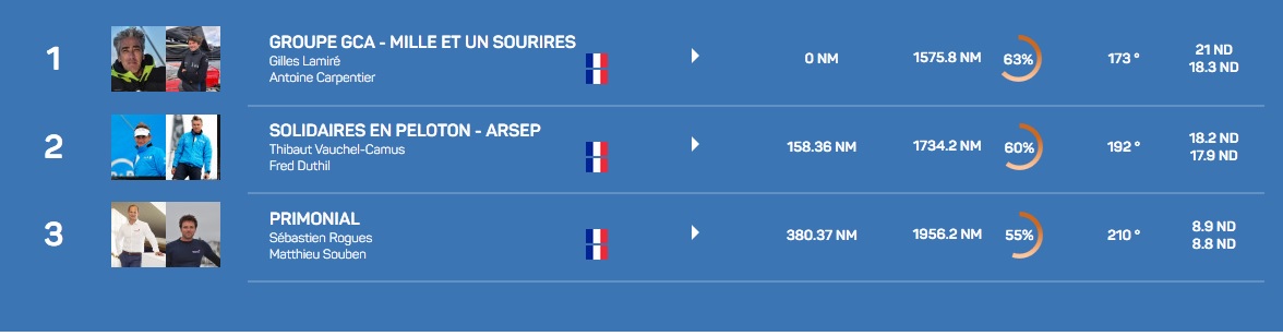 Primonial est reparti à 2 h 30 cette nuit de Mindelo (Cap Vert) où il a changé son démarreur (il ne pouvait plus produire d’électricité avec son moteur). L’infortuné tandem Rogues-Souben a donc 344 milles de retard sur ses deux concurrents qui continuent leur cavalcade dans l’alizé. A ce jeu, GCA Mille et un sourires détient manifestement un plus en vitesse et l’écart avec son poursuivant Solidaires en Peloton ARSEP continue de se creuser au fil des classements. Il culmine à 155 milles ce matin. Rien n’est gagné à l’entrée du Pot-au-noir que Gilles Lamiré et Antoine Carpentier atteindront ce soir. Mais force est de reconnaître qu’ils ont le contrôle de la situation avec leur concurrent pile dans l’axe, à une demi-journée de mer derrière eux. « Ils ont un très bon timing dans les bascules reconnaissait ce matin Thibaut Vauchel Camus. Et ils vont vite ! On a le sentiment de se bagarrer derrière et c’est un peu frustrant. A bord, pour nous tout va bien, on n’a rien cassé mais on n’a quasiment jamais trouvé la même force et le même angle de vent qu’eux, c’est tout »