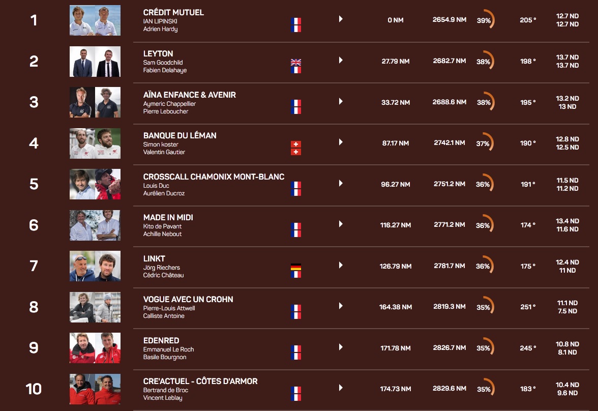 Encore derrière, il y aura du jeu jusqu’au bout autour de la onzième place avec cinq bateaux qui se tiennent en 100 milles et beaucoup d’écart en latéral. A noter aussi le bon retour dans le jeu de VandB Mayenne. Maxime Sorel et Guillaume Lebrec cravachent depuis leur arrêt à Brest lundi dernier. Après avoir doublé Time for Oceans, La Mie Câline Artisans Artipôle et La Fabrique, ils se hissent ce matin à la hauteur de Groupe Sétin et Water Family à la 19ème place…