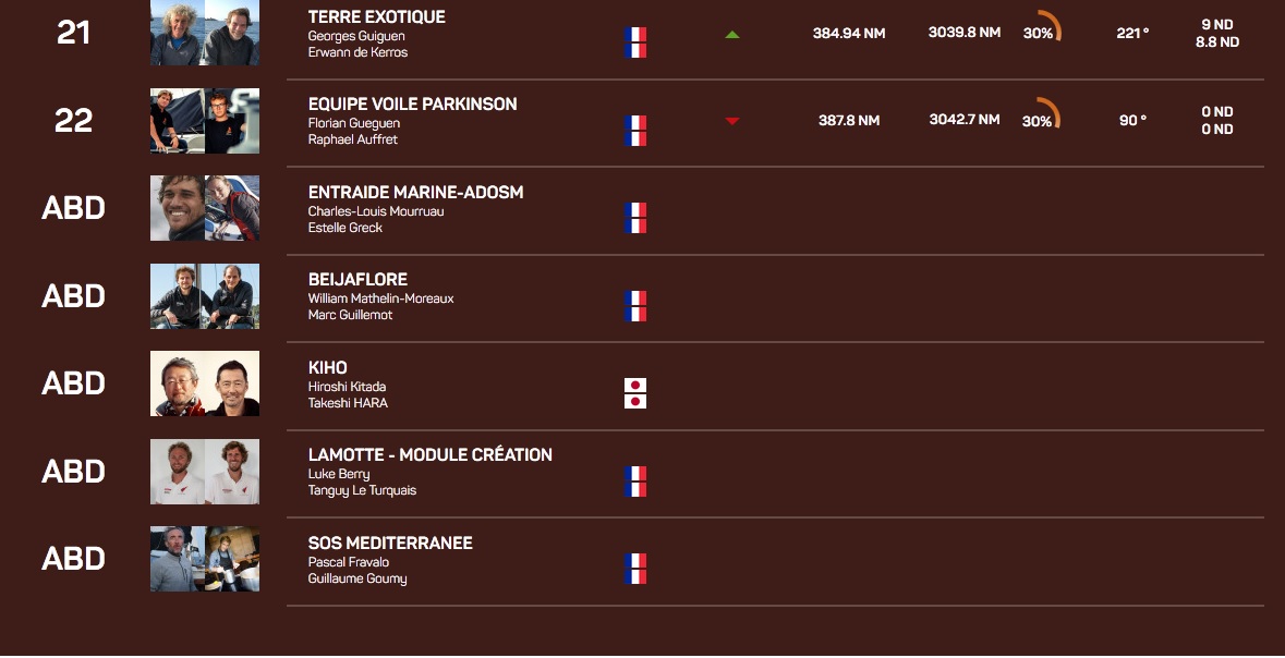 6 abandons : 5 Class40 (Lamotte Module Créations, Beijaflore, SOS Méditerranée, Kiho, Entraide Marine ADOSM), 1 IMOCA (Hugo Boss qui navigue désormais sans quille. Devenue trop dangereuse pour l’intégrité du bateau, donc de l’équipage, Alex Thomson et Neal Mc Donald ont dû la libérer. Ils naviguent avec les foils sortis et le fond ballasté).